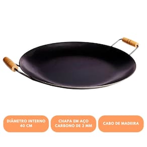 - Fabricado em chapa de aço carbono de alta resistência - Espessura de 3mm: aquece rápido e distribui o calor de forma uniforme - Diâmetro de 40 cm: ideal para preparar refeições para toda a família - Cabos em madeira resistentes ao calor para manuseio seguro - Compatível com fogão à lenha, disco de arado, fogareiro, entre outros