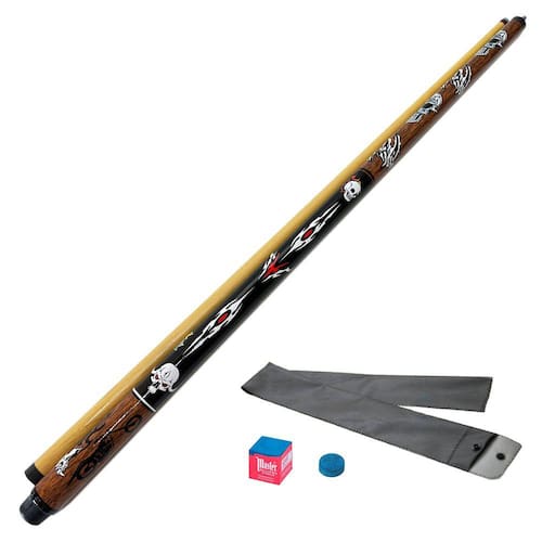O acabamento do Taco Desmontável Marrom Caveira é feito com tintas e verniz PU, que garantem um aspecto brilhante e durável, sem amarelar com o passar do tempo. A emenda é de metal, garantindo a segurança e a durabilidade do taco.