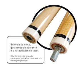 O acabamento do Taco Desmontável Raio Preto é feito com tintas e verniz PU, que garantem um aspecto brilhante e durável, sem amarelar com o passar do tempo. A emenda é de metal, garantindo a segurança e a durabilidade do taco.