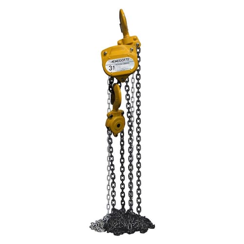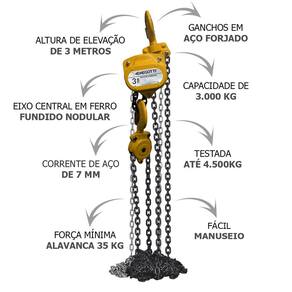 Desenvolvida com uma corrente de aço de 7 mm de alta resistência e sistema de elevação manual eficiente, que permite elevação de até 3 metros, com segurança garantida por testes de carga de até 4500 kg.