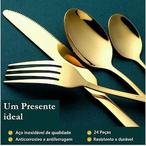 Kit 24 Peças Com Maleta Personalizada Este Jogo De Talher oferece design, aliado à sofisticação e funcionalidade, as peças são confeccionadas em aço Inox e atende as mais variadas necessidades do dia a dia Este Kit Contém:- 6 colheres- 6 garfos- 6 facas- 6 Colheres De Sobremesa- 1 Maleta Exclusiva Personalizada Marca:DUSSELDORFModelo:kit 24 Peças Com Maleta PersonalizadaUnidades por kit:24COR DOURADO . Sobre a Limpeza:Por favor, use detergente neutro para nivelar colher de faca e conjunto de garfo, especialmente as configurações de colher. Não use produtos químicos oxidantes fortes ou alcalinos fortes para lavar o conjunto de talheres