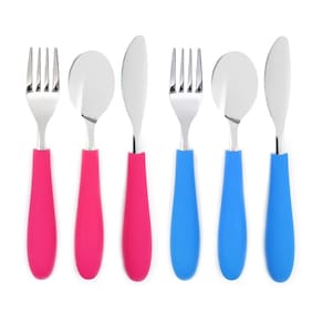 - Crianças mais velhas: Projetado para crianças mais velhas (mais de 4 anos) com alças mais longas e ponta de colher e garfo mais largos. A borda serrilhada da faca tem uma lâmina arredondada sem bordas afiadas para mantê-la segura para os dedinhos. Esta faca pode ser usada com segurança para cortar tudo, desde carnes e vegetais, incentivando a independência das crianças e construindo autoconfiança.