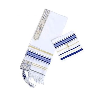 cor: azul e dourado. Segue com bolsa de transporte. A brachá bênção contida na atarah do manto: a oração na atarah do talit diz: bendito és tu senhor nosso deus rei do mundo/universo, que nos santificou com seus mandamentos e nos ordenou envolver-nos no talit. Marca: Jerusalém