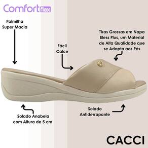 O solado em formato anabela com aproximadamente cinco centímetros foi projetado para proporcionar equilíbrio e suavidade aos movimentos. A base conta com tratamento antiderrapante, que ajuda a evitar escorregões e dá mais confiança ao caminhar em variados tipos de superfícies. Essa combinação entre estabilidade, altura moderada e conforto faz com que a sandália seja ideal para o dia a dia, entregando firmeza, leveza e bem-estar contínuo. Um calçado pensado para quem valoriza praticidade e quer sentir conforto do começo ao fim.