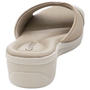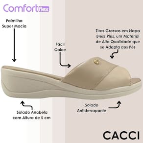 O solado em formato anabela com aproximadamente cinco centímetros foi projetado para proporcionar equilíbrio e suavidade aos movimentos. A base conta com tratamento antiderrapante, que ajuda a evitar escorregões e dá mais confiança ao caminhar em variados tipos de superfícies. Essa combinação entre estabilidade, altura moderada e conforto faz com que a sandália seja ideal para o dia a dia, entregando firmeza, leveza e bem-estar contínuo. Um calçado pensado para quem valoriza praticidade e quer sentir conforto do começo ao fim.