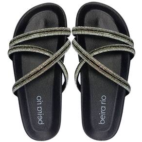 O tamanco Beira Rio combina elegância e conforto em um design estilo papete chinelo slide. Possui tiras resistentes decoradas com strass, proporcionando um toque de brilho e sofisticação ao calçado. O solado flat oferece leveza e conforto, ideal para o uso diário.