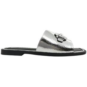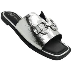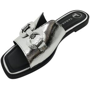 A parte superior do slide é confeccionada em couro de alta qualidade, com um acabamento impecável. A aplicação metalizada está estrategicamente posicionada, criando um efeito visual impactante e elegante. Minimalista com um ar sofisticado e versátil, permite que ele seja combinado com diversas peças de roupa e acessórios. Com a altura da sola de 1,0 cm, o Slide Tanara é a opção ideal para quem busca conforto e estilo sem abrir mão da praticidade.