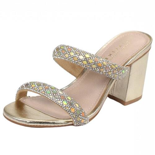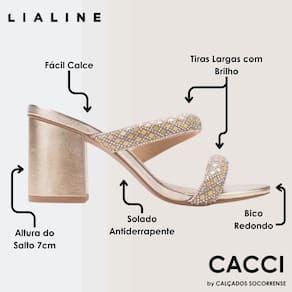 Tamanco feminino Lia Line confeccionado em material alternativo metalizado é perfeita para looks comfy. Modelo com duas tiras frontais com strass que destaca muito este modelo para as fashionistas, salto bloco médio com 7cm de altura, solado emborrachado antiderrapante e forro em material têxtil.