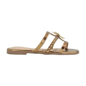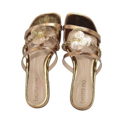 Rasteirinha delicada com detalhes metalizados, fivelas ou aplicação de flores/brilho. Modelo rasteira (flat) da coleção Beira Rio Conforto, frequentemente associado ao estilo primavera/verão