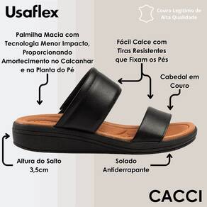 Ideal para quem não abre mão de bem-estar no dia a dia, este tamanco feminino Usaflex combina conforto e elegância em cada detalhe. Seu design com salto anabela de três centímetros e meio proporciona leve elevação sem comprometer a estabilidade, enquanto a palmilha macia conta com tecnologia de menor impacto, oferecendo amortecimento tanto no calcanhar quanto na planta dos pés.