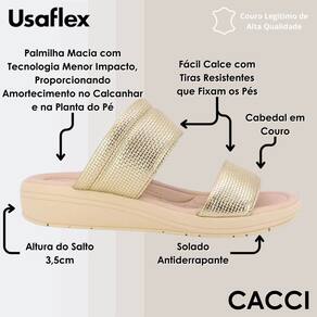 Ideal para quem não abre mão de bem-estar no dia a dia, este tamanco feminino Usaflex combina conforto e elegância em cada detalhe. Seu design com salto anabela de três centímetros e meio proporciona leve elevação sem comprometer a estabilidade, enquanto a palmilha macia conta com tecnologia de menor impacto, oferecendo amortecimento tanto no calcanhar quanto na planta dos pés.
