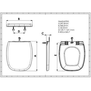 ESPECIFICAÇÕES TÉCNICAS 📌 Cor: Branco, Bege – (ESCOLHER NO ANÚNCIO). 📌 Modelo: Almofadado. 📌 Material: Plástico. 📌 Medidas: Conforme imagem do anúncio. • Comprimento: 39,6cm. • Largura: 34,9cm. • Espessura (Assento + tampa): 4,2cm. • Distância entre parafusos de: 14,8 até 16cm.