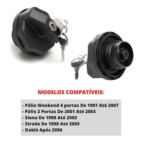 Tampa Combustível Palio Weekend 97 98 99 00 01 02 Até 2007 [f103] CONTEÚDO DA EMBALAGEM - - 01 Tampa De Combustível Valvulada Com Rosca E Chave APLICAÇÃO NOS SEGUINTES VEÍCULOS: -