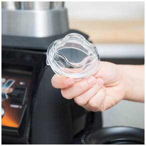 Possui design com abertura central para inserção de utensílios ou ingredientes, integrando-se ao jarro de copo graduado.