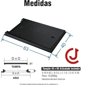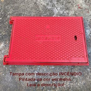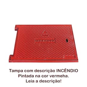 Tampa de incêndio hidrante recalque 40x60 ferro vermelha A tampa de padrão incêndio foi projetada para tampar a válvula de incêndio com descrição na tampa e também caixas de passagem de tubulação, esgoto, águas pluviais, água potável, redes de telecomunicações, eletricidade entre outros. Indicação: registro de recalque. Material: ferro fundido. Acabamento: pintura cor vermelha Atenção: a tampa vai pintada na cor vermelha com tinta esmalte sintético, muito cuidado na instalação do produto para não danificar o acabamento na parte superior da tampa. Modelo: tampão articulado. Peso: 15,600kg Peso suportado: 500kg Venda garantida com Atenção Suporta passagem apenas de veículos leves . Temos uma linha completa em tampas de ferro e pvc para construção como, tampões para proteger caixas de passagem, tampa de esgoto, tampa de águas pluviais, tampa de ferro fundido tampa de água potável, tampa para calçada, tampa de ferro elétrica, entre outros. Marca: Não Informado