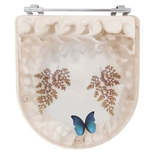 Tampa De Vaso Acrílico Calypso Bege Decorada com Borboleta Azul para Incepa é a escolha perfeita para seu banheiro. O Assento Sanitário Poliéster é considerado o melhor tipo de assentos sanitários do mercado pelo seu acabamento impecável e excelente durabilidade.