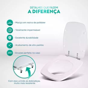 Limpeza: recomenda-se a limpeza do assento sanitário poliéster com água e sabão neutro, não utilizar produtos abrasivos.