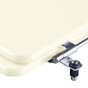 O encaixe do assento sanitário no vaso é feito por uma ferragem metálica que não oxida e não enferruja.