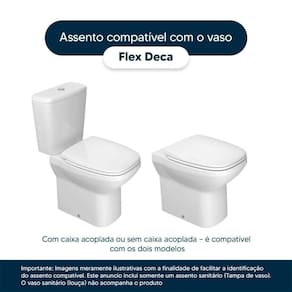 Instalação Simples e Rápida: Com todos os parafusos e componentes necessários inclusos, a instalação é rápida e descomplicada. Seu novo assento estará pronto para uso em questão de minutos. Desenvolvido especificamente para o modelo Flex da marca Deca, com ou sem caixa acoplada, proporciona um encaixe perfeito, oferecendo estabilidade e conforto durante o uso.