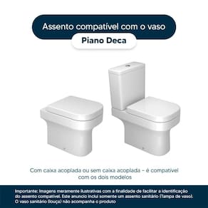 Instalação Simples e Rápida: Com todos os parafusos e componentes necessários inclusos, a instalação é rápida e descomplicada. Seu novo assento estará pronto para uso em questão de minutos. Desenvolvido especificamente para o modelo Piano da marca Deca, com ou sem caixa acoplada, proporciona um encaixe perfeito, oferecendo estabilidade e conforto durante o uso.