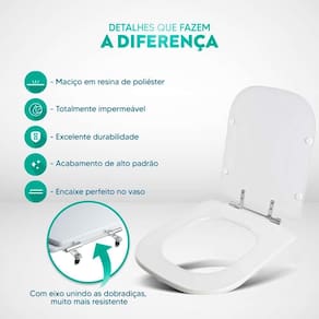 Durabilidade e Resistência: Fabricado em resina maciça de poliéster, este assento sanitário é altamente resistente e totalmente impermeável.