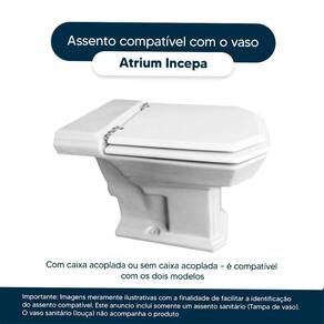 Detalhes e Cuidados Especiais: * Cor: Biscuit (Bege Claro) * Compatibilidade: Modelo Atrium da marca Incepa * Medidas entre os furos: 24,5cm * Conteúdo da Embalagem: Assento sanitário, parafusos de fixação e instruções de instalação. * Fabricante do Assento Sanitário: Pontto Lavabo.