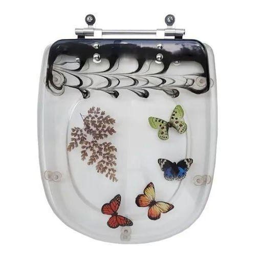 Cor: O assento (parte onde senta) é transparente. A tampa é decorada preta com 4 borboletas.