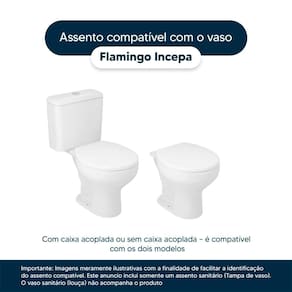 Detalhes e Cuidados Especiais: * Cor: Branco * Compatibilidade: Modelo Flamingoda marca Incepa * Conteúdo da Embalagem: Assento sanitário, ferragem completa, parafusos de fixação e instruções de instalação. * Conteúdo da Embalagem: Assento sanitário, ferragem completa, parafusos de fixação e instruções de instalação. Dicas para Uso e Manutenção: Encaixe os parafusos com as borrachas nos furos do vaso e aperte com uma chave de fenda no sentido horário. Para a limpeza, pano úmido e sabão neutro, evitando produtos abrasivos ou químicos. Secar com um pano logo após a limpeza ajuda a preservar a durabilidade do produto. Não pode ser lavado com água abundante ou ficar molhado. Não pode usar ducha higiênica.