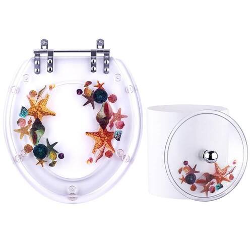 Kit contendo 1 assento sanitário decorado Fundo do Mar e 1 lixeira na mesma decoração. Escolha perfeita para completar seu banheiro. Assento Sanitário em resina de poliester, material semelhante ao acrílico só que mais robusto / resistente. É totalmente impermeável. O assento (parte onde senta) é transparente em resina translucida. A tampa é transparente com decoração de Fundo do Mar. A decoração é uma transparência que fica dentro da resina, não sai e não desbota com a limpeza diária. Lixeira decorada com tampa em resina de poliester, no mesmo material e decoração do assento sanitário. O corpo da lixeira é em plástico polipropileno, muito resistente e fácil de limpar. Medidas do assento sanitário: 43cm comprimento x 38cm largura x 15cm distancia entre os parafusos. É compatível com vasos sanitários de modelo convencional / oval / universal. Medidas da lixeira: 20cm altura x 20cm largura
