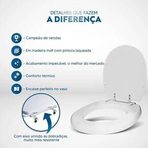 Itens inclusos: assento e tampa em madeira MDF com pintura laqueada. Ferragens metálicas em alumínio anodizado muito resistente, não oxidam e não enferrujam.
