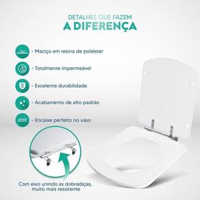 Limpeza: recomenda-se a limpeza do assento sanitário poliéster com água e sabão neutro, não utilizar produtos abrasivos.