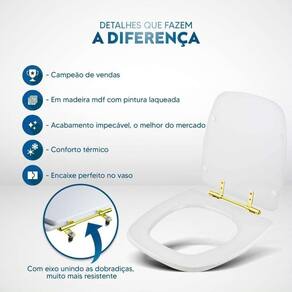 Durabilidade e Resistência: Fabricado em MDF com camadas de pintura laqueada, este assento oferece não apenas beleza, mas também conforto térmico e alta resistência. Seu acabamento impecável adiciona um toque de classe ao seu banheiro.