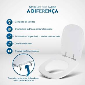 Itens inclusos: assento e tampa em madeira MDF com pintura laqueada. Ferragens metálicas em alumínio anodizado muito resistente, não oxidam e não enferrujam.