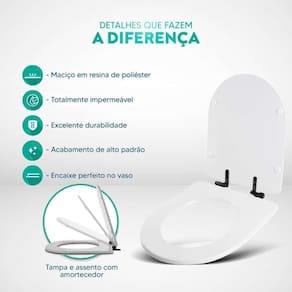 Durabilidade e Resistência: Fabricado em resina maciça de poliéster, este assento sanitário é altamente resistente e totalmente impermeável.