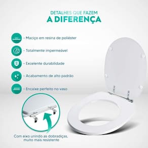 Limpeza: recomenda-se a limpeza do assento sanitário poliéster com água e sabão neutro, não utilizar produtos abrasivos.