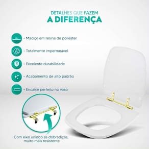 Tampa De Vaso Poliéster Like Branco Para Bacia Celite Com Ferragem Dourada