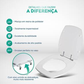 Limpeza: recomenda-se a limpeza do assento sanitário poliéster com água e sabão neutro, não utilizar produtos abrasivos.