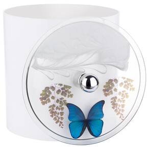 O corpo do cesto é produzido em plástico polipropileno na cor Branco, é muito resistente e fácil de limpar. A tampa é fabricada em Resina Poliéster transparente decorado com Borboleta Azul, possui acabamento impecável e irá trazer ainda mais elogios para seu banheiro. A decoração é uma transparência que fica dentro da resina, não sai e não desbota com a limpeza diária.