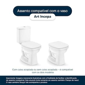 Detalhes e Cuidados Especiais: * Cor: Branco * Compatibilidade: Modelo Art da marca Incepa * Conteúdo da Embalagem: Assento sanitário, parafusos de fixação e instruções de instalação. * Fabricante do Assento Sanitário: Pontto Lavabo.