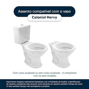 Detalhes e Cuidados Especiais: * Cor: Branco * Compatibilidade: Modelo Colonial da marca Hervy * Conteúdo da Embalagem: Assento sanitário, parafusos de fixação e instruções de instalação. * Fabricante do Assento Sanitário: Pontto Lavabo.
