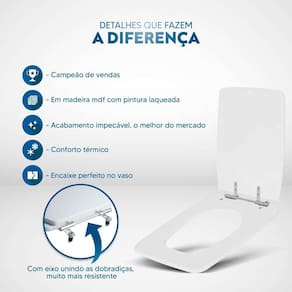 Itens inclusos: assento e tampa em madeira MDF com pintura laqueada. Ferragens metálicas em alumínio anodizado muito resistente, não oxidam e não enferrujam.