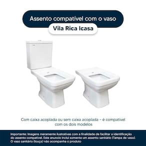 Este assento sanitário é compatível para uso em vaso sanitário Icasa modelo Vila Rica com ou sem caixa acoplada.