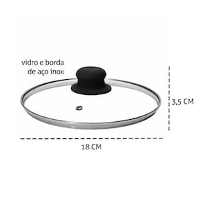 Tampa de vidro, aço inox e cabo de baquelite. Produzido em material durável, resistente a temperaturas de até 140ºC. Pode ser utilizado em lava louças. Ideal para panelas com diâmetro de 18 cm.