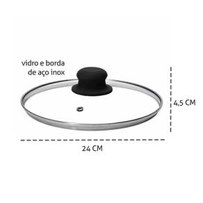 Tampa de vidro, aço inox e cabo de baquelite. Produzido em material durável, resistente a temperaturas de até 140ºC. Pode ser utilizado em lava louças. Ideal para panelas com diâmetro de 24 cm.