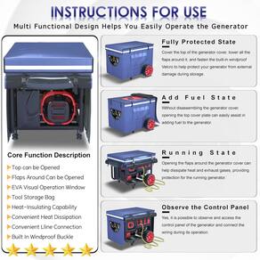 - {Recurso exclusivo de uso duplo}: A tampa externa do gerador GEHENG tem um recurso de uso duplo. Ao usar o gerador, enrole as abas ao redor dele e a tampa do gerador fornecerá proteção de segurança contra vento, chuva, neve e outros aspectos ao ar livre. Quando você não estiver usando o gerador, basta colocar as abas ao redor dele e a tampa do gerador fornecerá proteção abrangente de armazenamento à prova de poeira para o gerador.