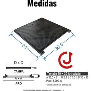 Tampa Esgoto Calçada Elétrica Gordura 30X30 Ferro Articulada Especificações do produto Características técnicas: projetado para tampar, caixas de passagem de tubulação, esgoto, águas pluviais, água potável, redes de telecomunicações, eletricidade entre outros. Facilitando o acesso a válvulas, registros, quadro de distribuição. Produto Nome: tampão 30x30 articulado ferro. Indicação: caixas de passagem. Material: Ferro fundido. Acabamento: pintura cor preta esmalte sintético . Modelo: Esgoto : 30 dias contra defeito de fabricação Peso: 4,500 kg Carga máxima nominal por eixo: 300 kg Suporta passagem de veículos leves em áreas de trafego baixo exemplo garagem e calçada.