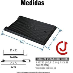 Tampa Tampão De Incêndio Hidrante Recalque 40 X 60 Ferro PRODUTO Nome: Tampão 40x60 Incêndio Articulado ESPECIFICAÇÕES DO PRODUTO Características Técnicas: Projetado para tampar, caixas de passagem de tubulação, esgoto, águas pluviais, água potável, redes de telecomunicações, eletricidade entre outros. Mais indicado o uso para tampar válvula de incêndio com descrição na tampa. Indicação: Registro de recalque. Material: Ferro fundido. Acabamento: Pintura cor preto Modelo: Tampão articulado para recalque de incêndio. Garantia: 30 dias contra defeito de fabricação Peso: 15,600 kg Carga máxima nominal por eixo: 400 kg Suporta passagem de veículos leves em áreas de trafego baixo exemplo garagem e calçada. Marca: Casa E Jardim Comércio