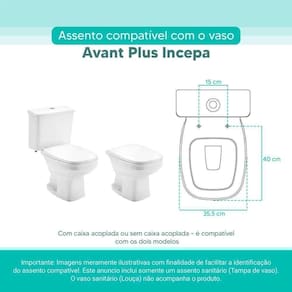 OBS.: O código 6LPF gravado na louça sanitária corresponde ao fluxo de água de uma descarga e não indica o modelo da mesma. RBN: Casa/Banho/Instalações e Acessórios de Banheiro/Vasos Sanitários e Peças/Assento de Vaso Sanitário | Conteúdo da Embalagem: 01 Assento Sanitário | Tipo: Assento Sanitário | Produto: Assento Sanitário | Site do Fabricante: www.ponttolavabo.com.br/ | Marca do Assento Sanitário: Pontto Lavabo | Garantia: 6 meses contra defeitos de fabricação | Dica: Instalação: sem desmontar o produto, posicione sobre o vaso sanitário e encaixe os dois parafusos com as borrachas pretas dentro do furo do vaso. Aperte com a chave de fenda no sentido horário até ficar firme. | Para Vaso Sanitário do Modelo: Avant Plus | Para vaso Sanitário da Marca: Incepa | Cor: Branco | Tonalidade: Branco | Material do Assento Sanitário: MDF Laqueado | Instruções de Limpeza: Recomenda-se a limpeza com pano úmido e sabão neutro, não utilizar produtos abrasivos ou químicos | Almofadado?: Não | Peso do Produto: 1.98 | Tipo de Fechamento: Fechamento Comum | Material da Fixação: Alumínio Anodizado | Precisa de baterias ou pilhas: Não | Regulamentações aplicáveis a produtos perigosos: Não se aplica | Código de certificação: Não se aplica Ean: 7899983693360