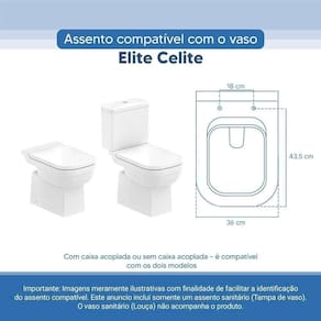 OBS.: O código 6LPF gravado na louça sanitária corresponde ao fluxo de água de uma descarga e não indica o modelo da mesma. RBN: Casa/Banho/Instalações e Acessórios de Banheiro/Vasos Sanitários e Peças/Assento de Vaso Sanitário | Conteúdo da Embalagem: 01 Assento Sanitário | Tipo: Assento Sanitário | Produto: Assento Sanitário | Site do Fabricante: www.ponttolavabo.com.br/ | Marca do Assento Sanitário: Pontto Lavabo | Garantia: 6 meses contra defeitos de fabricação | Dica: Instalação: sem desmontar o produto, posicione sobre o vaso sanitário e encaixe os dois parafusos com as borrachas pretas dentro do furo do vaso. Aperte com a chave de fenda no sentido horário até ficar firme. | Para Vaso Sanitário do Modelo: Elite | Para vaso Sanitário da Marca: Celite | Cor: Branco | Tonalidade: Branco | Material do Assento Sanitário: Poliéster | Instruções de Limpeza: Recomenda-se a limpeza com água e sabão neutro, não utilizar produtos abrasivos ou químicos | Almofadado?: Não | Peso do Produto: 2.98 | Tipo de Fechamento: Fechamento Comum | Material da Fixação: Alumínio Anodizado | Precisa de baterias ou pilhas: Não | Regulamentações aplicáveis a produtos perigosos: Não se aplica | Código de certificação: Não se aplica Ean: 7899983692059