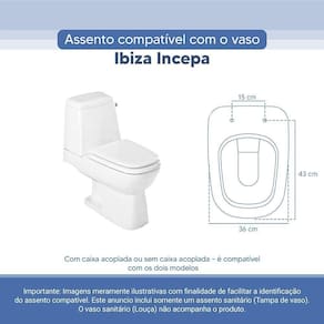 OBS.: O código 6LPF gravado na louça sanitária corresponde ao fluxo de água de uma descarga e não indica o modelo da mesma. RBN: Casa/Banho/Instalações e Acessórios de Banheiro/Vasos Sanitários e Peças/Assento de Vaso Sanitário | Conteúdo da Embalagem: 01 Assento Sanitário | Tipo: Assento Sanitário | Produto: Assento Sanitário | Site do Fabricante: | Marca do Assento Sanitário: Pontto Lavabo | : 6 meses contra defeitos de fabricação | Dica: Instalação: sem desmontar o produto, posicione sobre o vaso sanitário e encaixe os dois parafusos com as borrachas pretas dentro do furo do vaso. Aperte com a chave de fenda no sentido horário até ficar firme. | Para Vaso Sanitário do Modelo: Ibiza | Para vaso Sanitário da Marca: Incepa | Cor: Branco | Tonalidade: Branco | Material do Assento Sanitário: Poliéster | Instruções de Limpeza: Recomenda-se a limpeza com água e sabão neutro, não utilizar produtos abrasivos ou químicos | Almofadado?: Não | Peso do Produto: | Tipo de Fechamento: Fechamento Comum | Material da Fixação: Alumínio Anodizado | Precisa de baterias ou pilhas: Não | Regulamentações aplicáveis a produtos perigosos: Não aplicável | Código de certificação: Não aplicável | Ponto de Destaque01: Produzido em 100% Resina de Poliéster, impermeável | Ponto de Destaque02: Ferragem em Alumínio Anodizado (não enferruja, não oxida) | Ponto de Destaque03: Possui 15cm de distância entre furos | Ponto de Destaque04: Produto vai completo, fácil instalação | Ponto de Destaque05: Pontto Lavabo | Termos de Pesquisa01: Assento Sanitário; Tampa de Vaso Sanitário; Ibiza Branco Incepa; Ibiza 6lpf; Incepa 6lpf | Quantidade de itens: 1 | Fonte de energia: Não aplicável | Dimensões da embalagem: Altura: 5cm x Largura: 40cm x Comprimento: 50cm | de caixas: 1